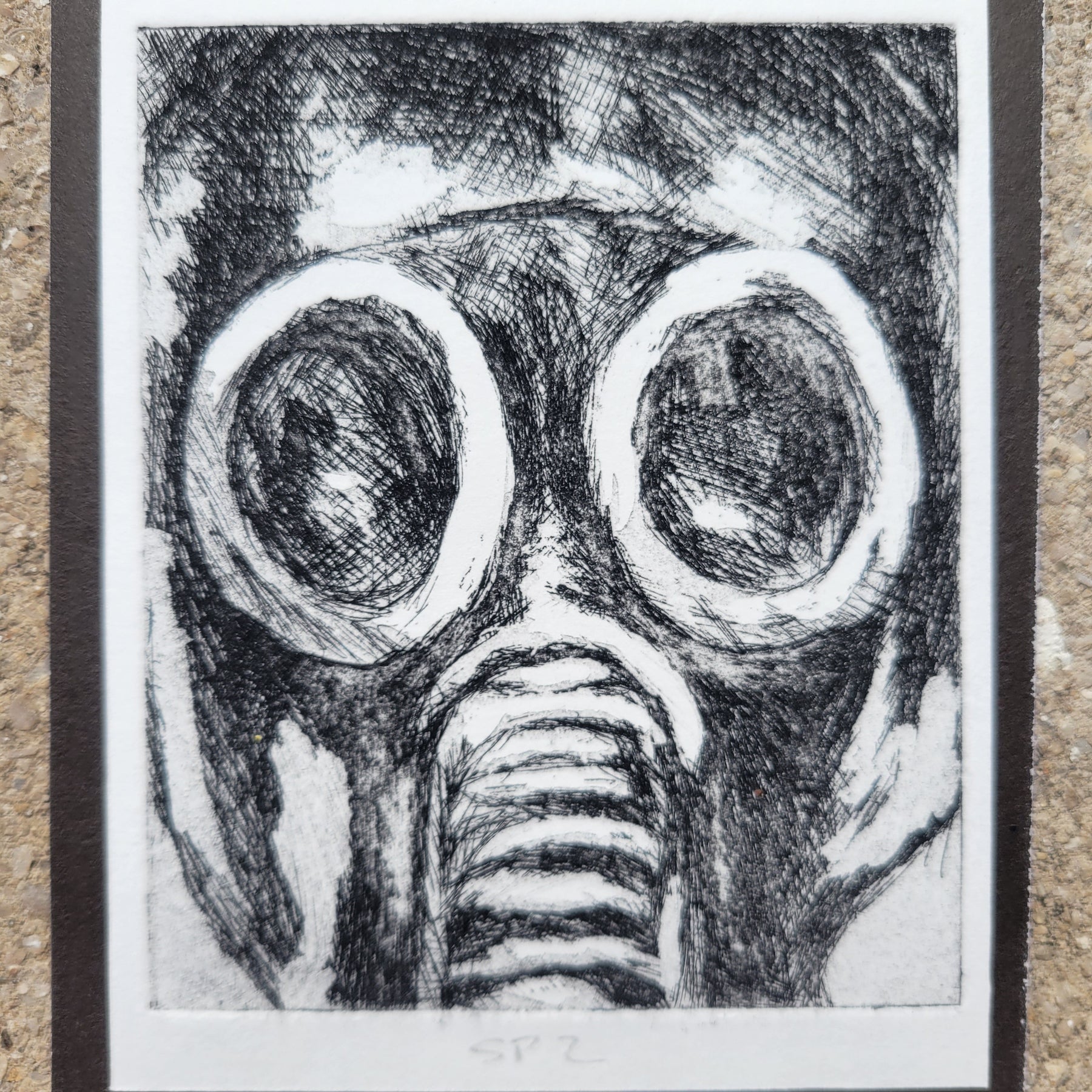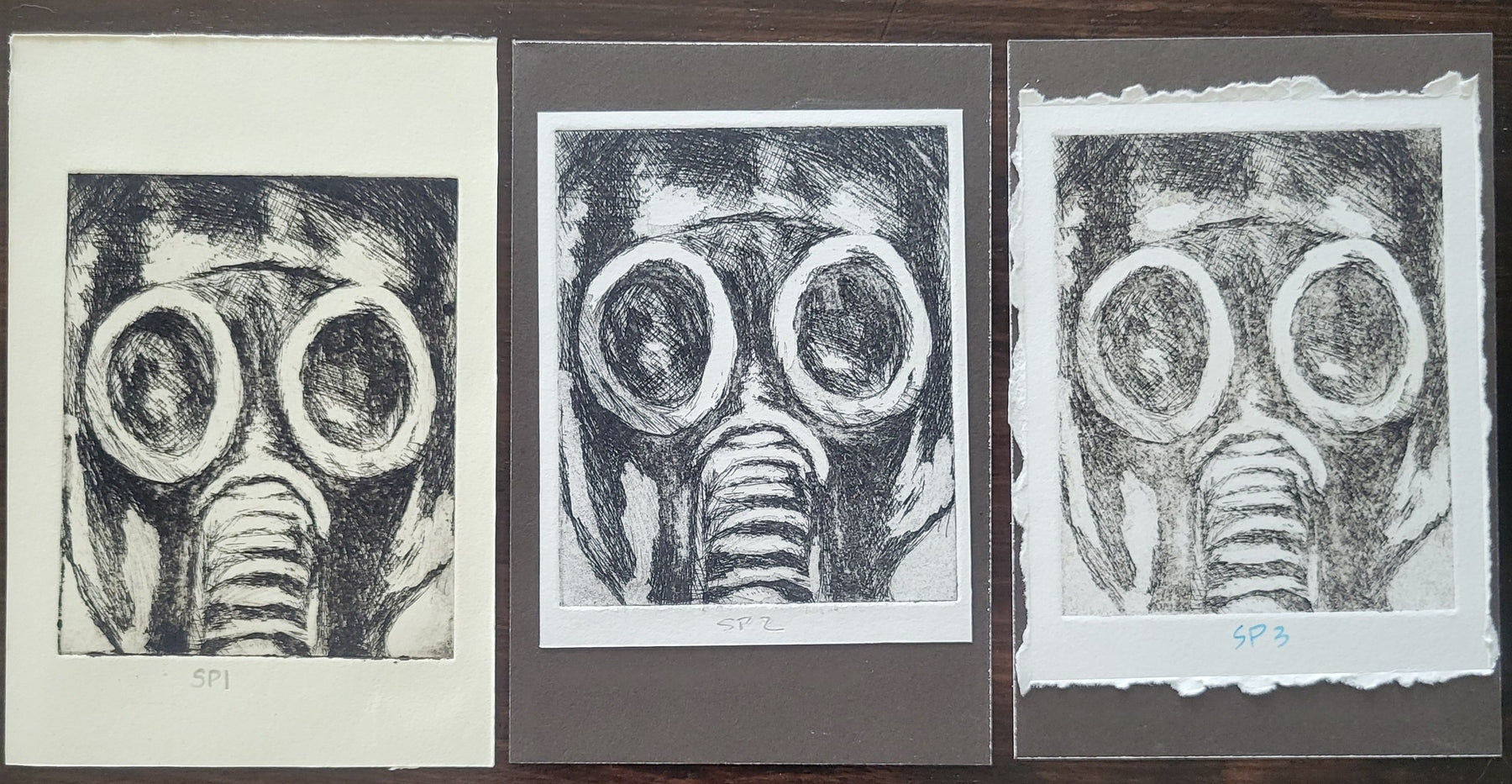 This little baby is 2 of 3 state proofs in preparation for the copper etching study (or close up) of the gas mask found in the work titled Trifecta on Sunday.