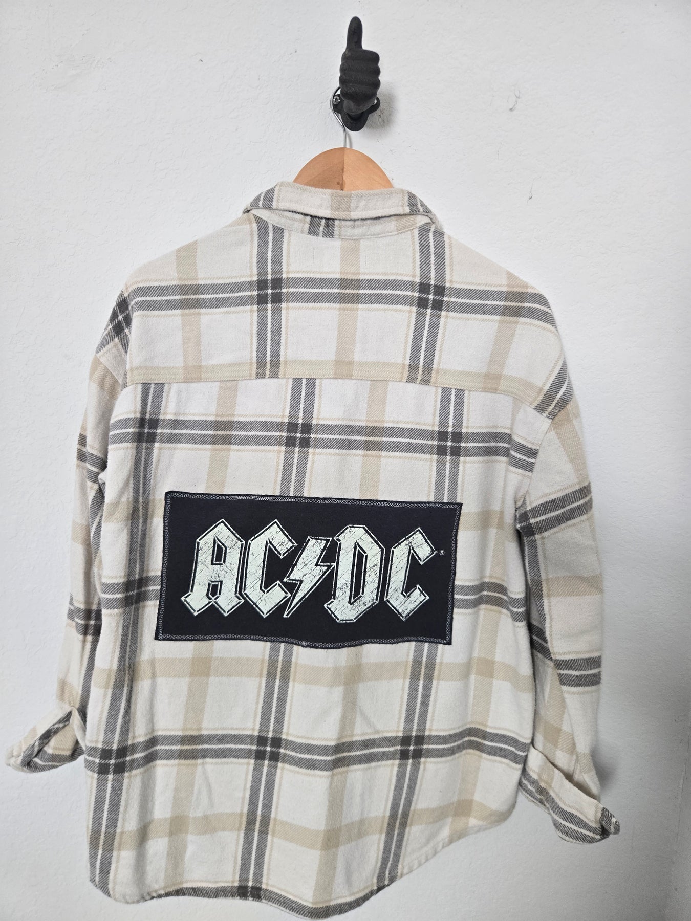 Upcycled, hand-sewn, Flannel featuring AC/DC.
