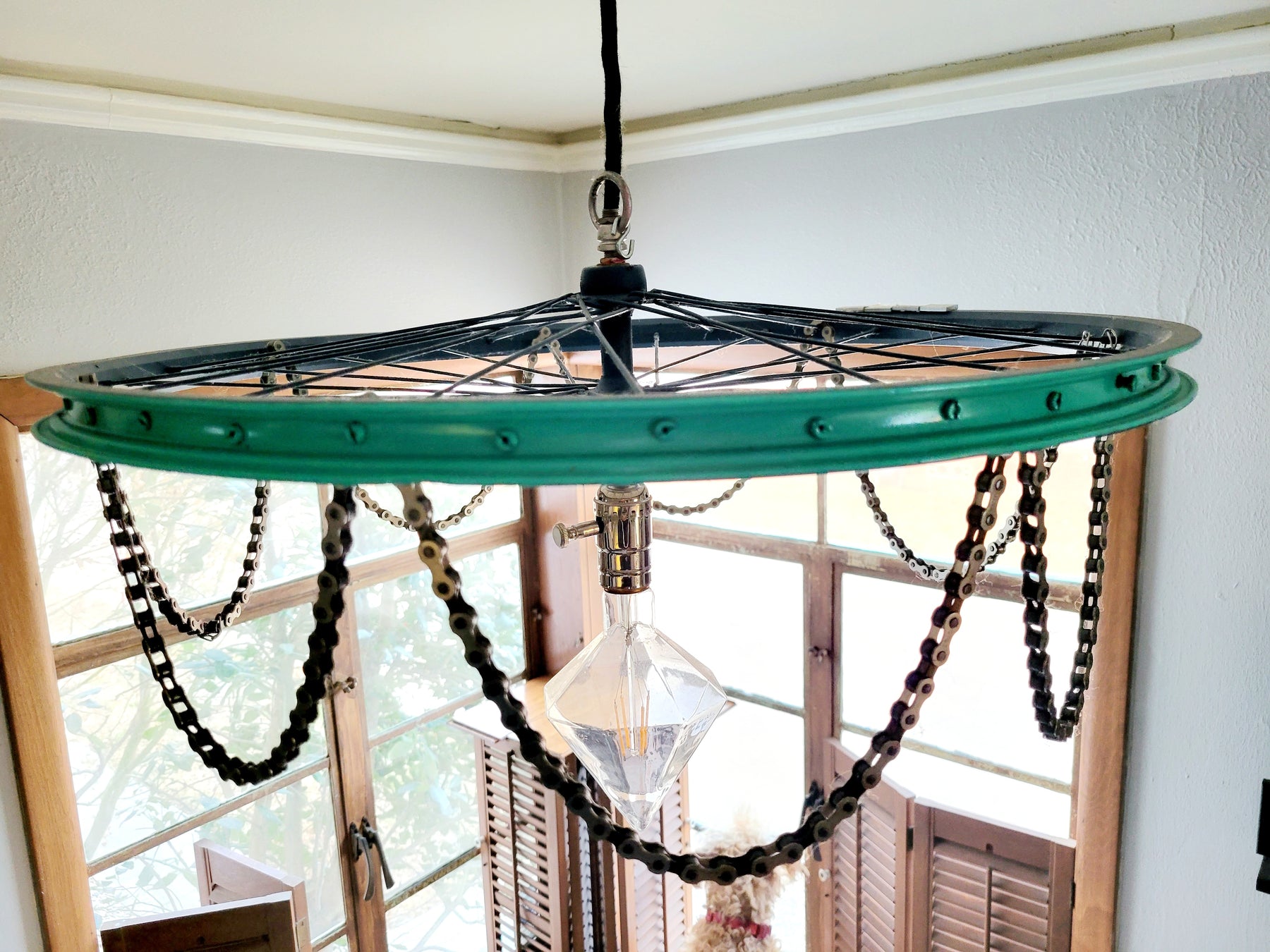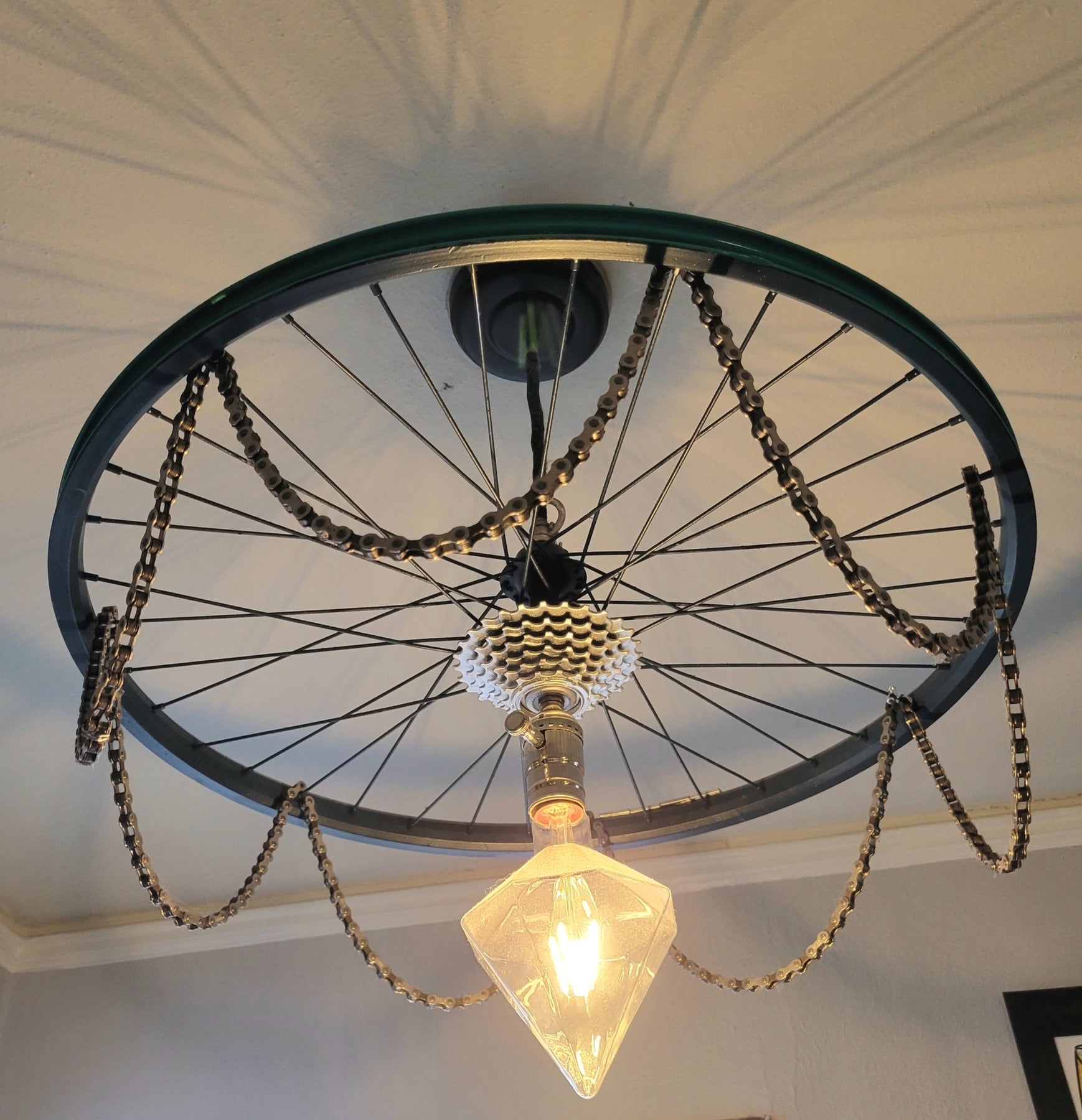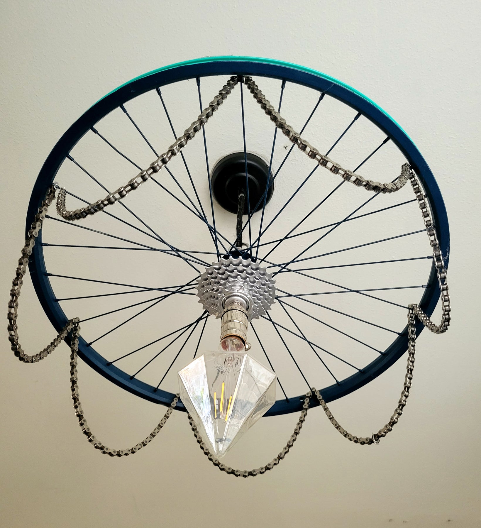 This two-tone teal and navy, ceiling mount bike-la-lier gets my heart spokes all happy-like. And those spokes just keep spreading the joy all over the ceiling!