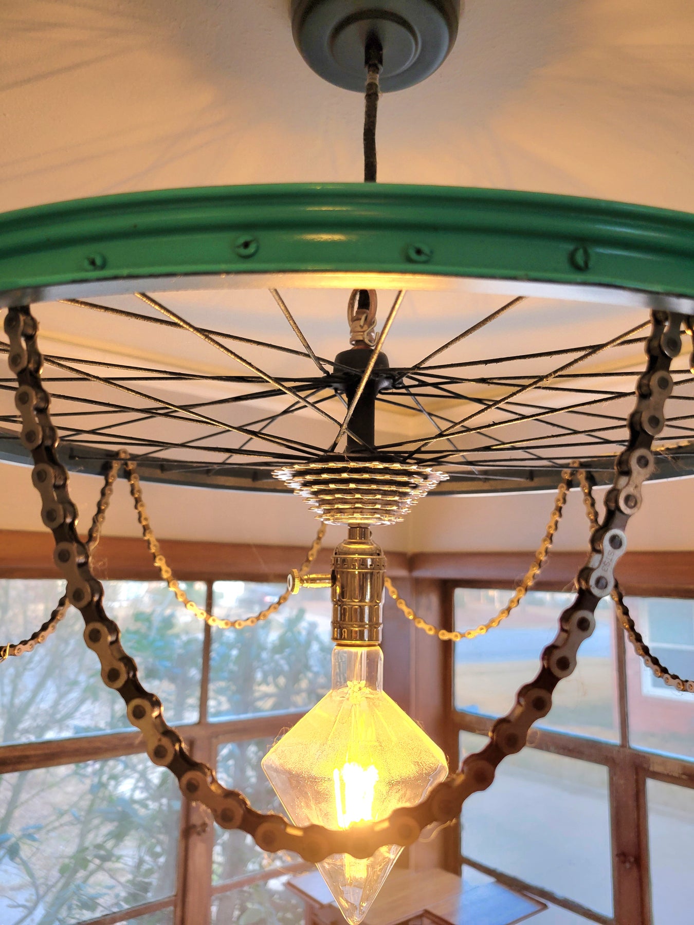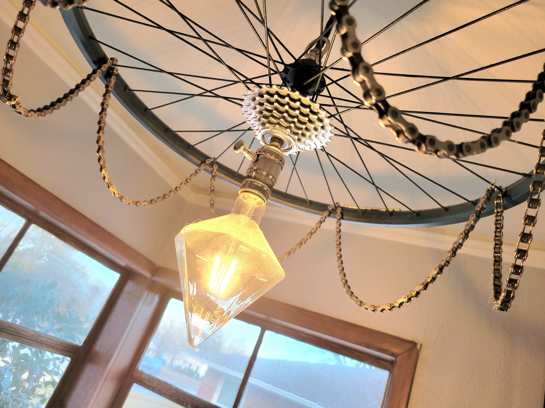 The chandelier has real bike chains to complete the look. And that fancy light bulb tho!