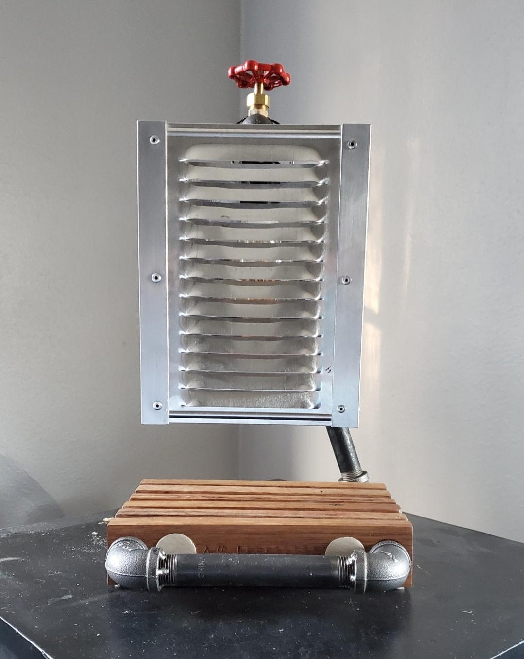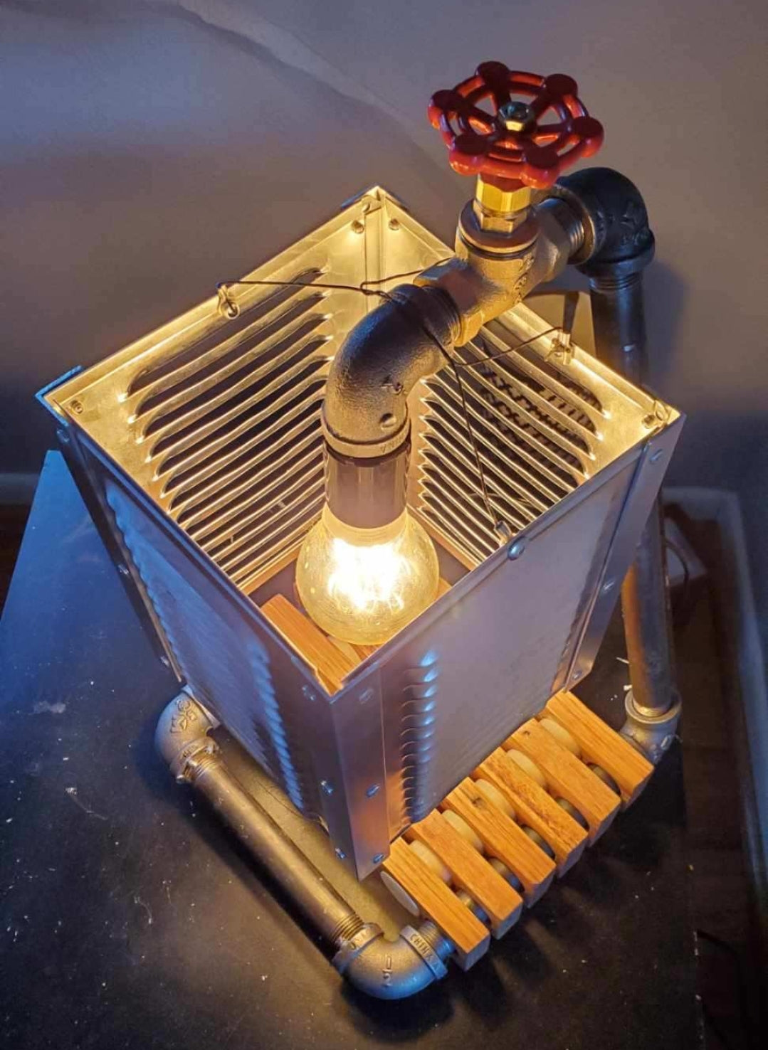 This little one turns on and off at the spigot. Vent crafted lamp shade. Wood base bottom.