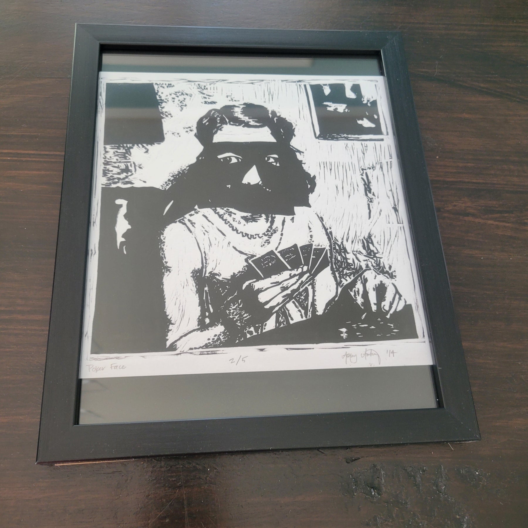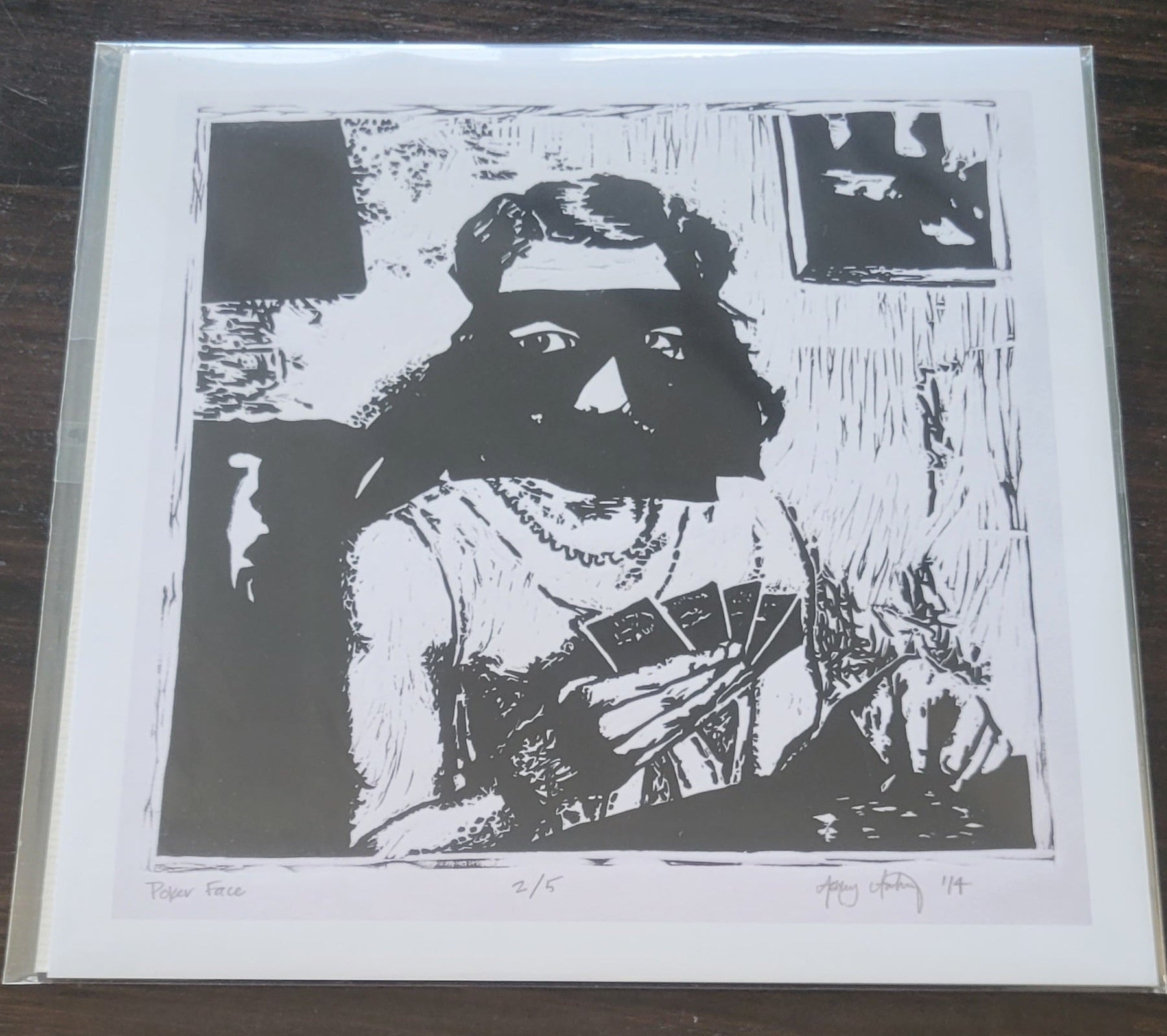 This is a Giclee printed copy of the "Poker Face" Linoleum Linocut Print, printed on archival matte-finished paper.