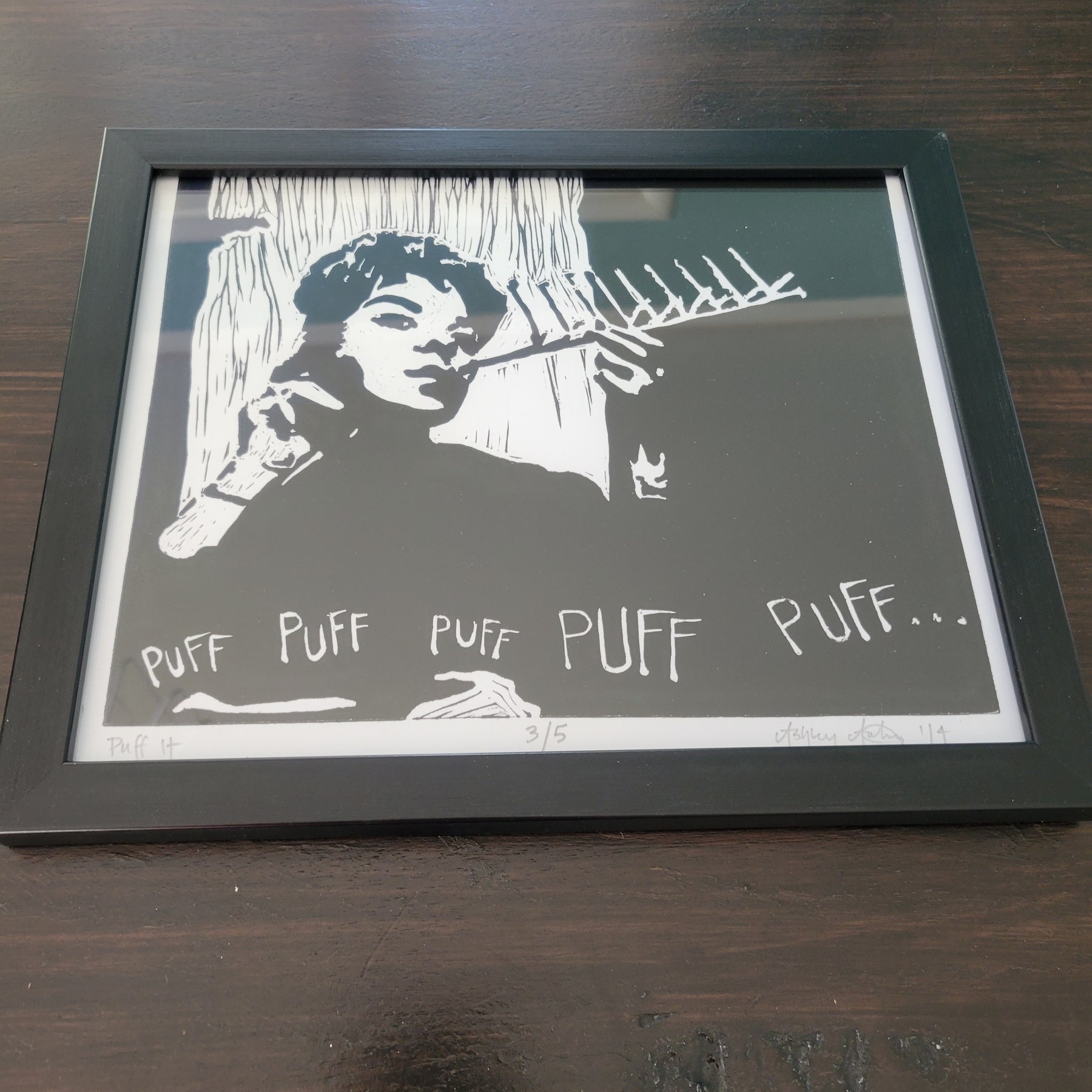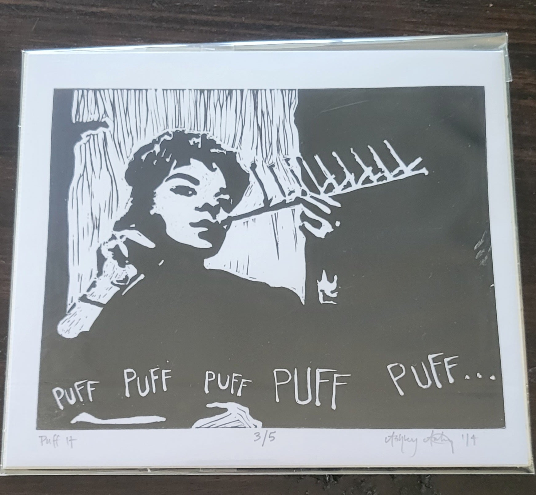 This is a Giclee printed copy of the "Puff It" Linoleum Linocut Print, printed on archival matte-finished paper.