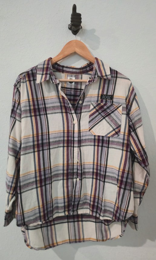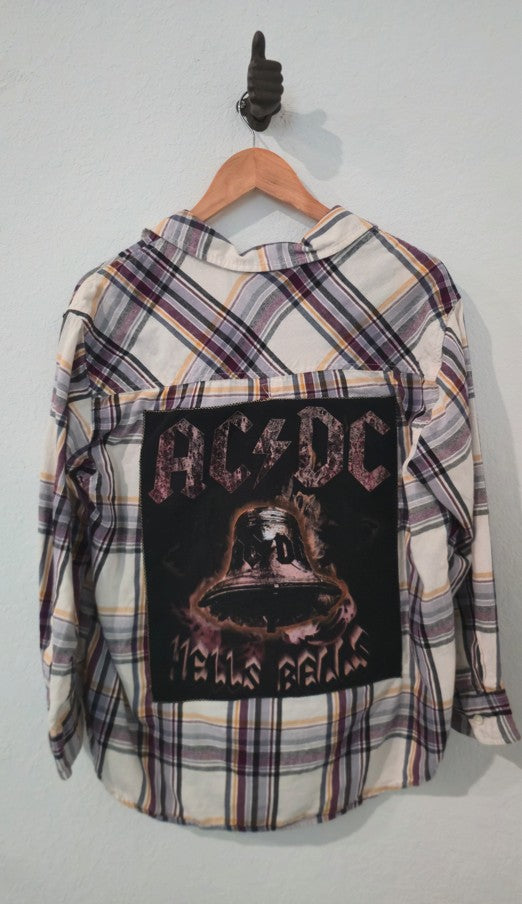 Upcycled hand-sewn Flannel featuring the Band, AC/DC.