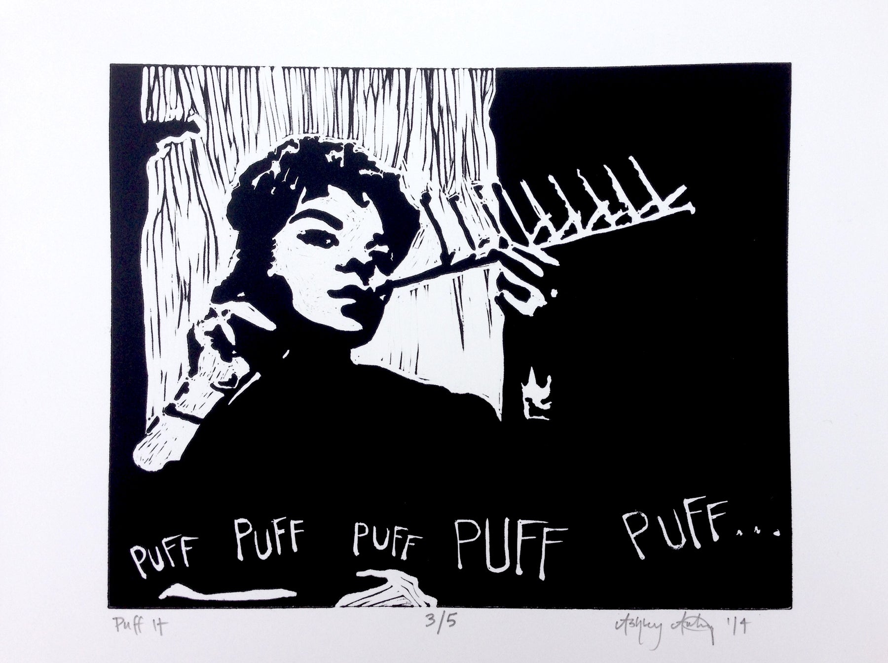 “Puff It” is a Hand Carved Linoleum Linocut Print. Edition of 5. As in, there will never be more than 5 of these original stuffs out there, ever.