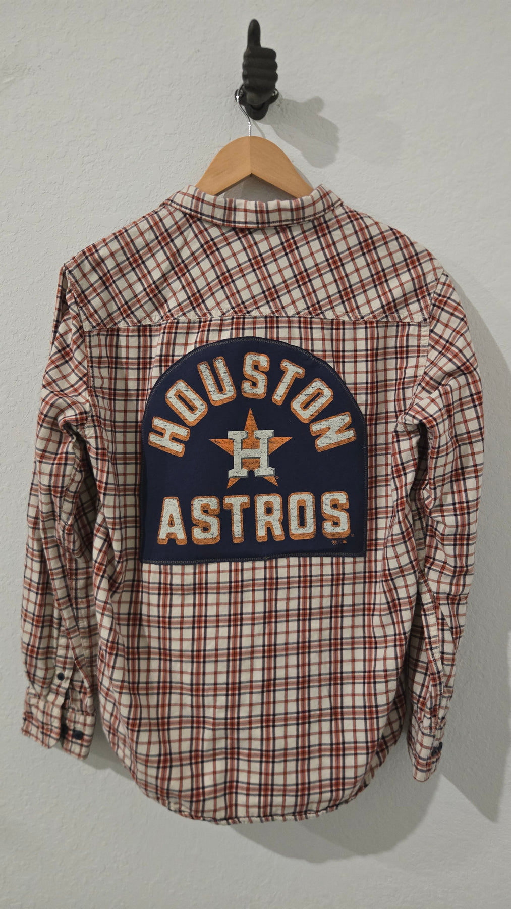 Upcycled hand-sewn Flannel featuring the Houston Astros.